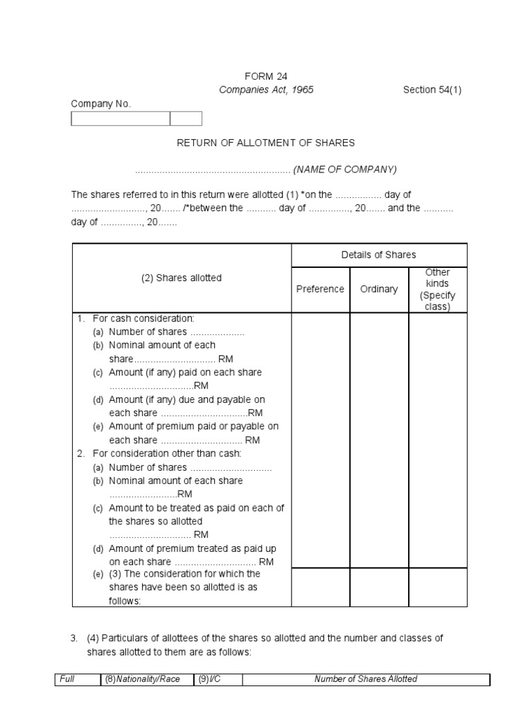 Or other specified securities within a period of six months except by way of a bonus issue or. If there are any changes in the information furnished in the application. As per the section 78 of the companies act 1956, the amount of securities premium can be used by the returned on equity shares. Learn vocabulary, terms and more with flashcards, games and other study tools. This video contains the discussion of provision of section 39 and 40 of companies act, 2013 w.r.t. A return of capital is not taxable; In return for an allotment of shares. 2 005 просмотров 2 тыс. Form 24 is used to allot new shares to shareholders of a sdn bhd company. Section 54 (1) provides that whenever a company limited by shares or a company limited by guarantee and having a share capital makes any allotment of its shares, the company shall, within sixty days thereafter, then there deliver to the registrar for registration Include the optional continuation pages if needed. Look at the retained earnings section of the company's balance sheet. Secretaries and changes of particulars document indicating the latest member of board of directors form of annual return (foar) / section 68 form of annual return of a company having a share capital document indicating the latest shareholding and board of directors general swec products.